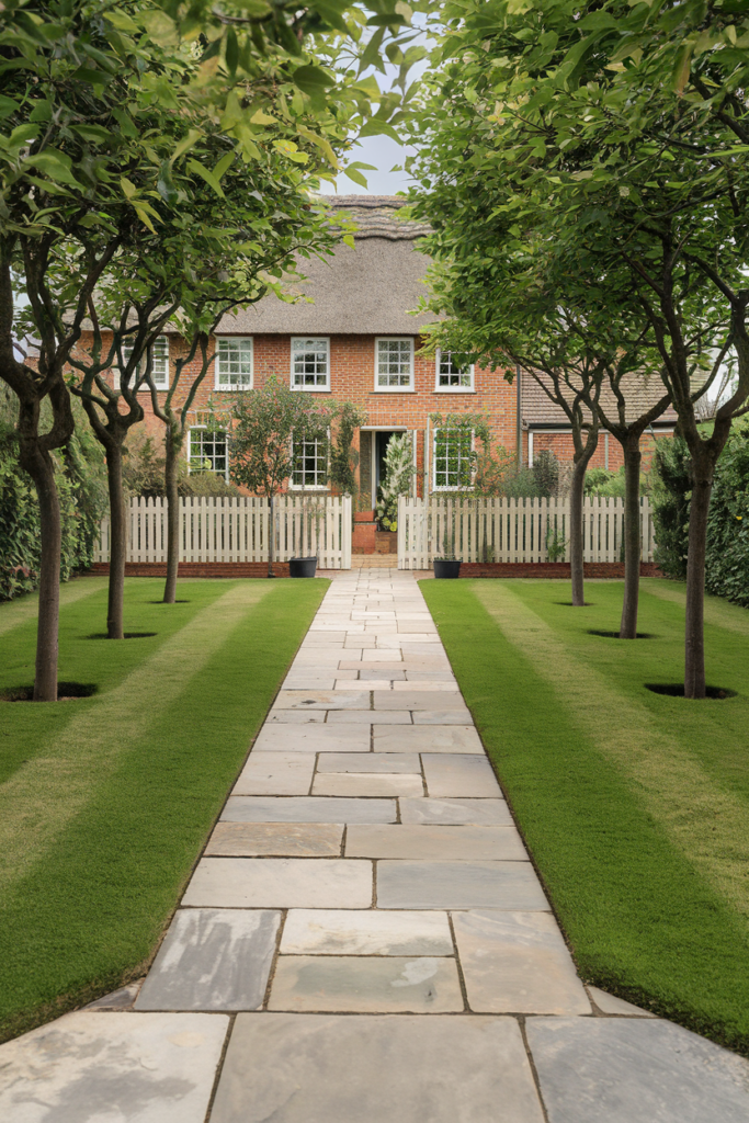 This impressive design features a wide, symmetrical flagstone path leading directly to a classic brick house with a thatched roof, flanked by two perfectly spaced rows of small, trimmed trees. The path is bordered by precisely cut strips of rich green lawn, leading up to a white picket fence.