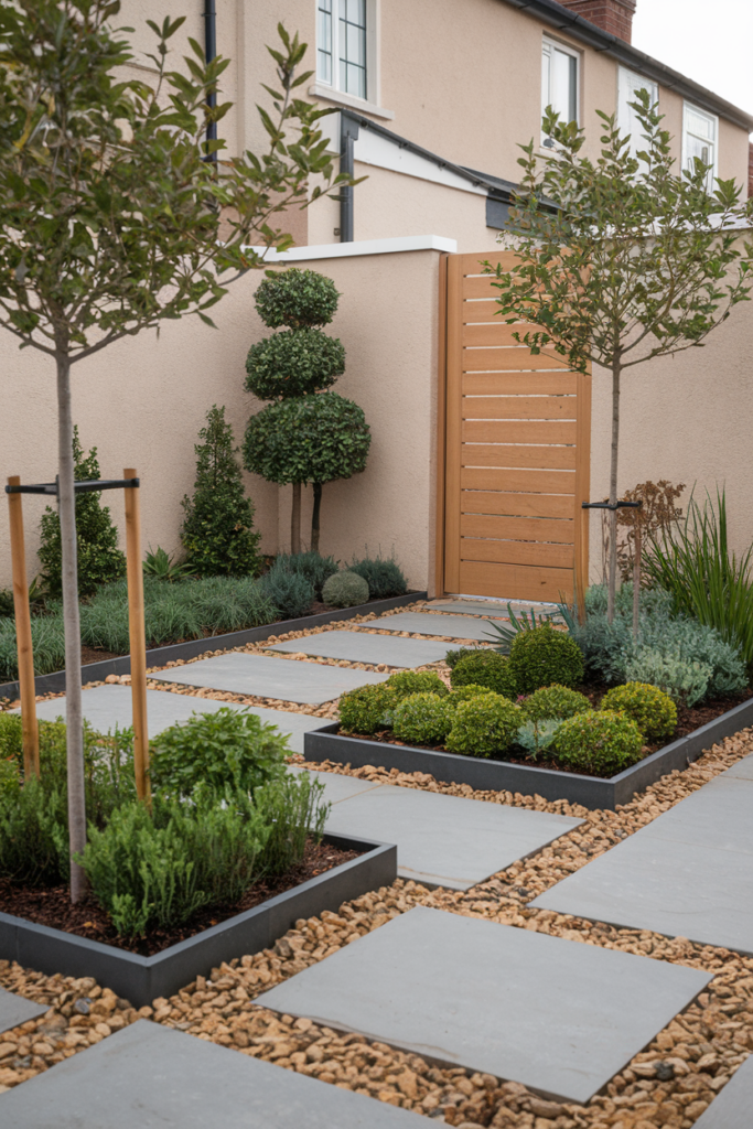 This is a great example of using evergreen hedging (like boxwood) to maintain structure year-round. Use the same gravel as a walkway material to visually connect all parts of your entrance.