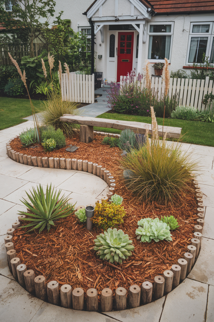 Framing a sunny patio area, this garden uses a soft, organic S-curve to define a bed filled with mulch, ornamental grasses, and succulents. The bed is edged with small, uniform wooden logs, creating a subtle rustic barrier against the light-colored paving stones.