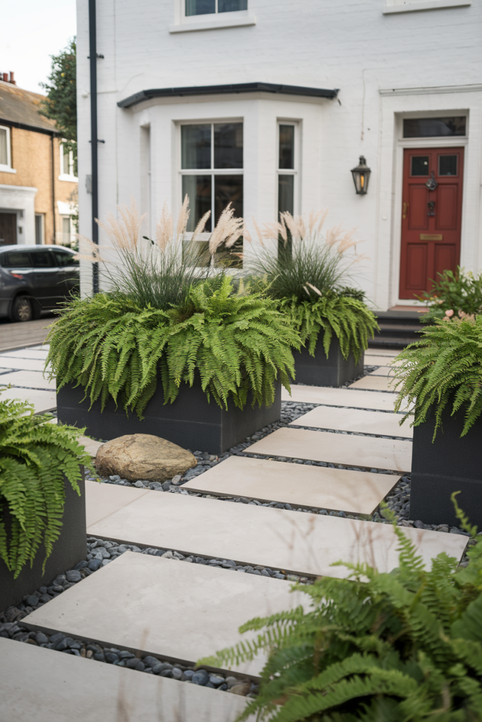 A sophisticated and dramatic entrance is created here using large, dark square planters filled with lush green ferns and feathery grasses. The planters sit on a modern path made of alternating large, rectangular light-gray pavers and bands of dark river stones, leading toward a red front door.