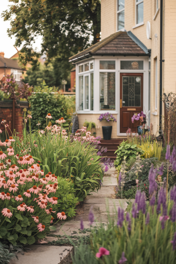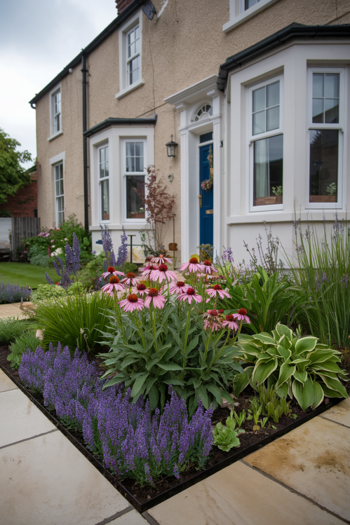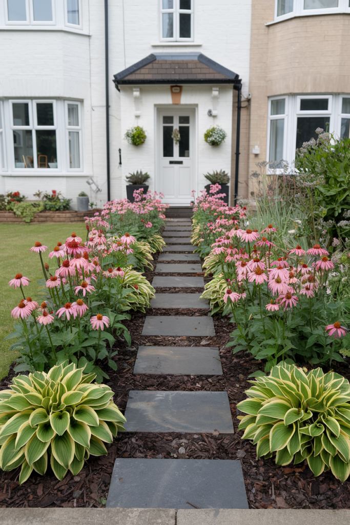 The symmetry of the planting emphasizes the depth of the pathway, drawing the visitor directly to the front door. The large, bold leaves of the hostas anchor the foreground, while the tall, delicate coneflowers add summery color and movement.