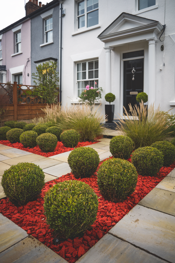 The design’s strength is its fearless use of color and geometry; the bright red ground cover makes the dark green boxwood balls visually pop, creating a theatrical effect. The rounded forms of the shrubs contrast beautifully with the sharp, square lines of the paving.