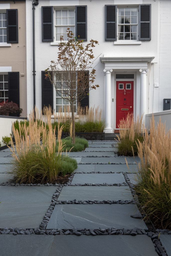 A modern and high-contrast approach is shown here with large, rectangular dark slate pavers separated by thin lines of small, dark grey or black river stones. The path is punctuated by bursts of tall, feathery ornamental grasses in warm blonde and green tones, leading to a vibrant red front door.