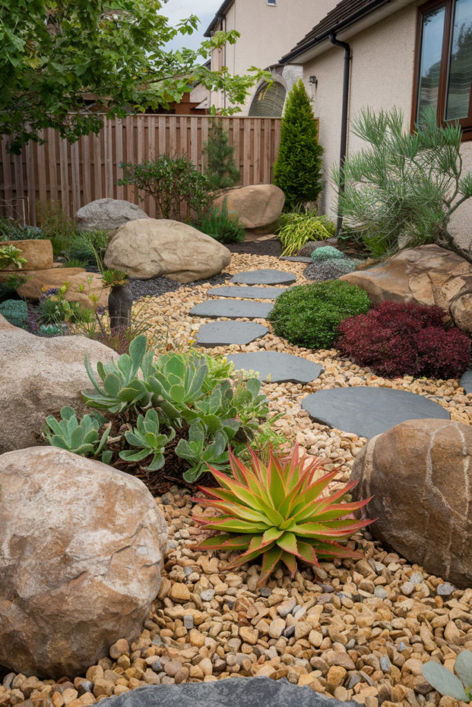 The design is highly effective because of the texture play: the smooth stones contrast with the rough boulders and the fine gravel, while the spiky succulents add architectural interest. It beautifully mimics a natural, arid landscape environment.