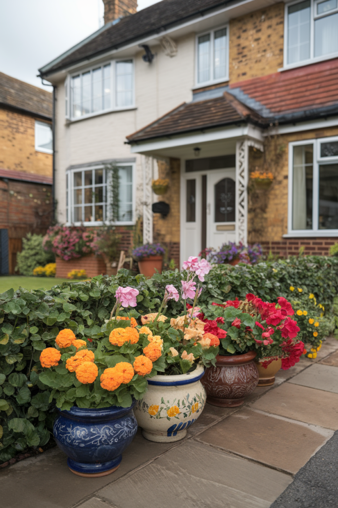 This simple yet effective design uses a row of mismatched ceramic and terracotta pots filled with colorful annuals (like orange marigolds and red geraniums) lined up along the edge of a paved walkway. A low, clipped hedge sits directly behind the pots, creating a defined backdrop.