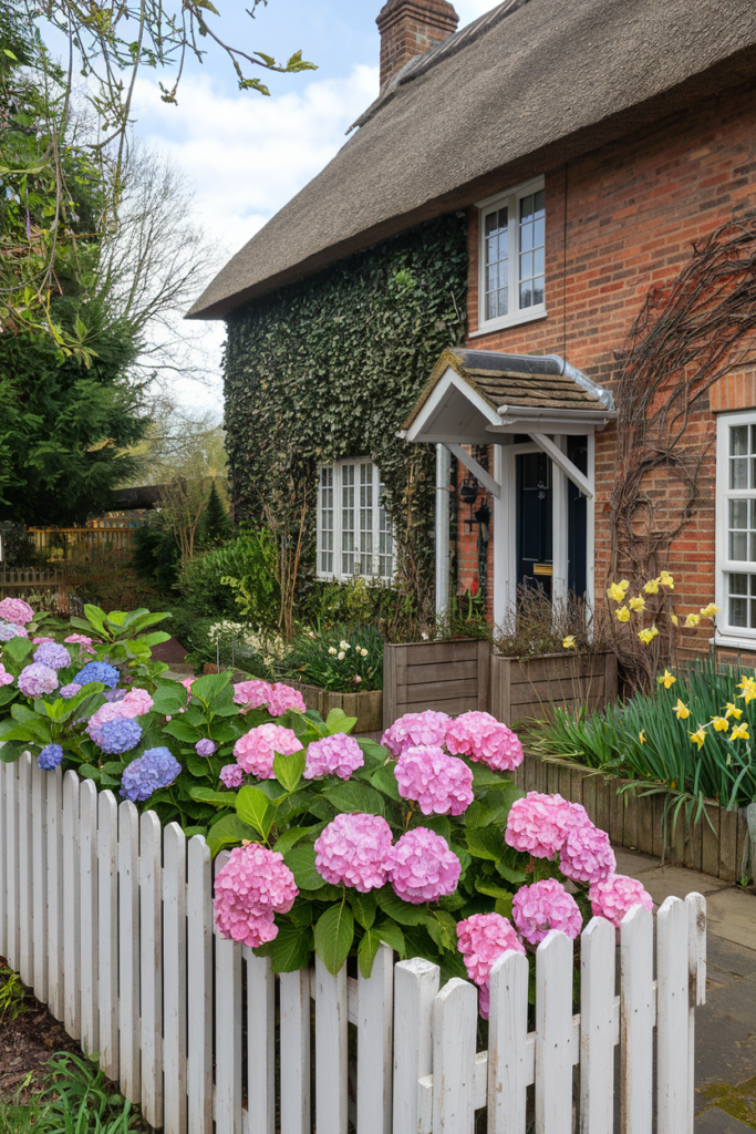 This design is a masterclass in using color and texture to dominate a space; the huge, colorful hydrangea blooms create an irresistible focal point. The juxtaposition of the charming white fence with the soft, overflowing blooms enhances the cottage feel.