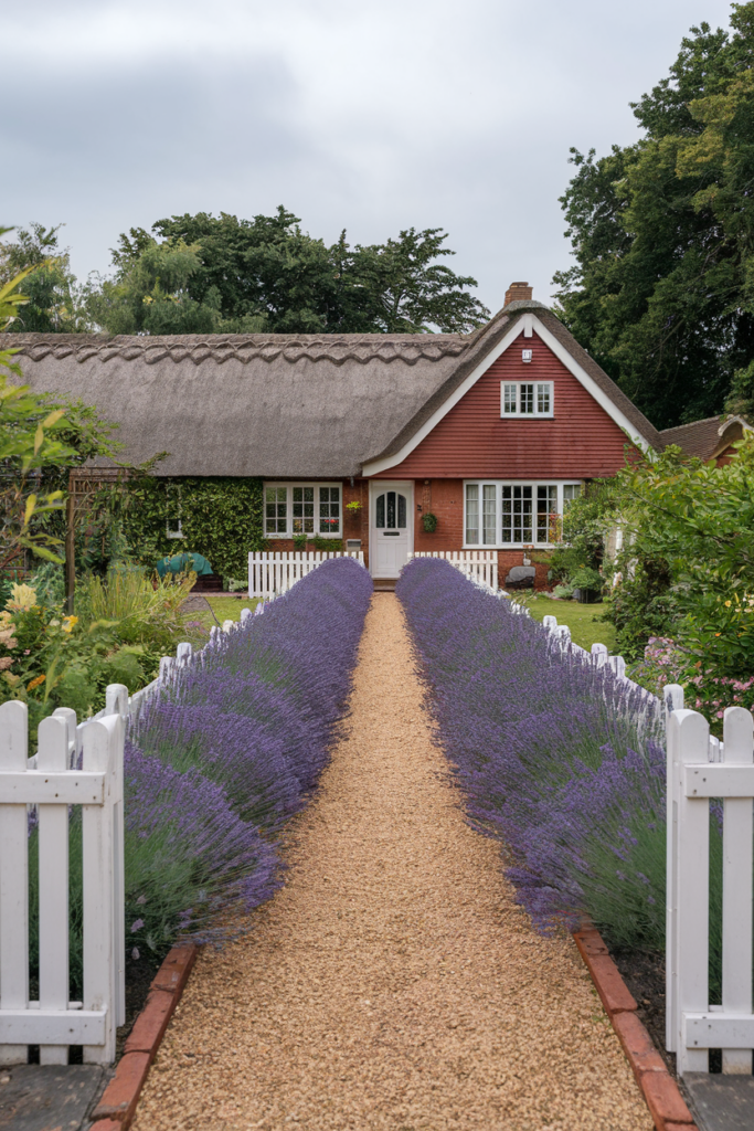 This classic rural scene features a straight pathway of light gravel bordered by a low white picket fence and two dense, fragrant hedges of flowering purple lavender. The path leads directly to the white front door of a red brick cottage with a beautiful thatched roof.