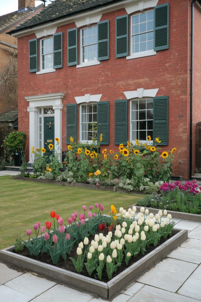 Set against a classic red brick house with dark green shutters, this garden uses a large, low raised bed filled with neat rows of pink and white tulips in the foreground. Another long bed behind it is packed with tall, cheerful sunflowers, creating a dynamic, layered display.