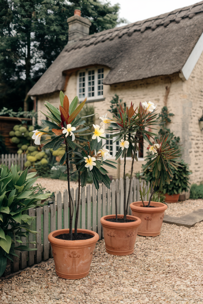 A simple but stylish entrance features three tall, tropical-looking plants with white flowers set in large, matching terracotta pots, placed directly on a light gravel foreground. The backdrop is a charming stone cottage with a thatched roof.