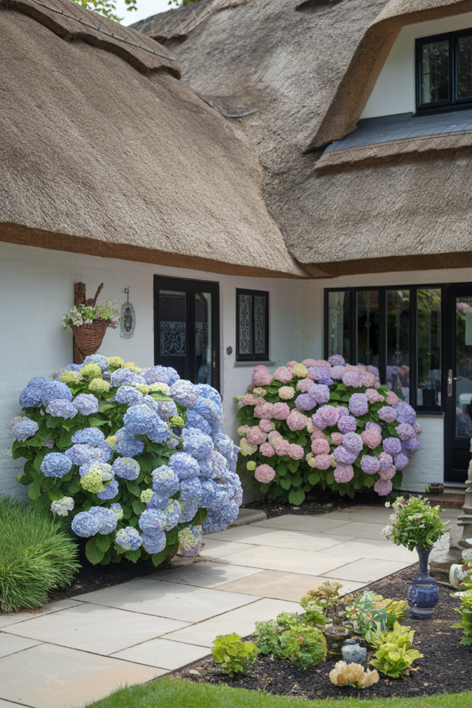 This picturesque entryway to a thatched cottage is flanked by two enormous, perfectly mounded hydrangea bushes—one blooming in soft blue and pale green, the other in soft pink and lilac. The plants sit against the white exterior walls next to dark-framed windows.