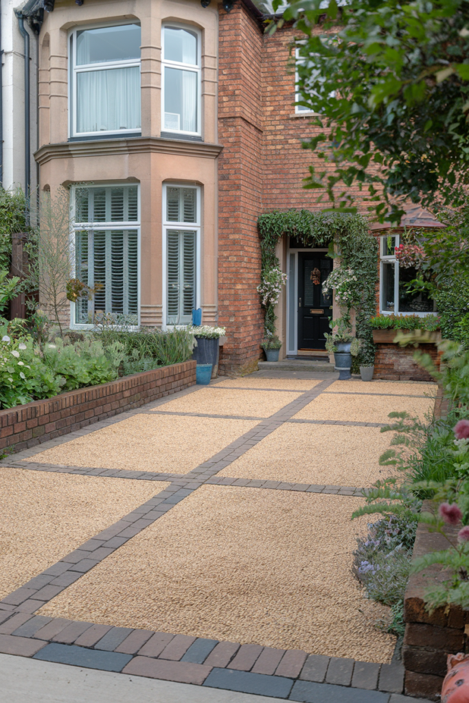 This welcoming driveway uses light, crushed gravel divided into large squares by intersecting bands of dark red brick, with a broader brick border surrounding the perimeter. Lush, informal planting borders the entire area, including a vine-covered archway near the door.