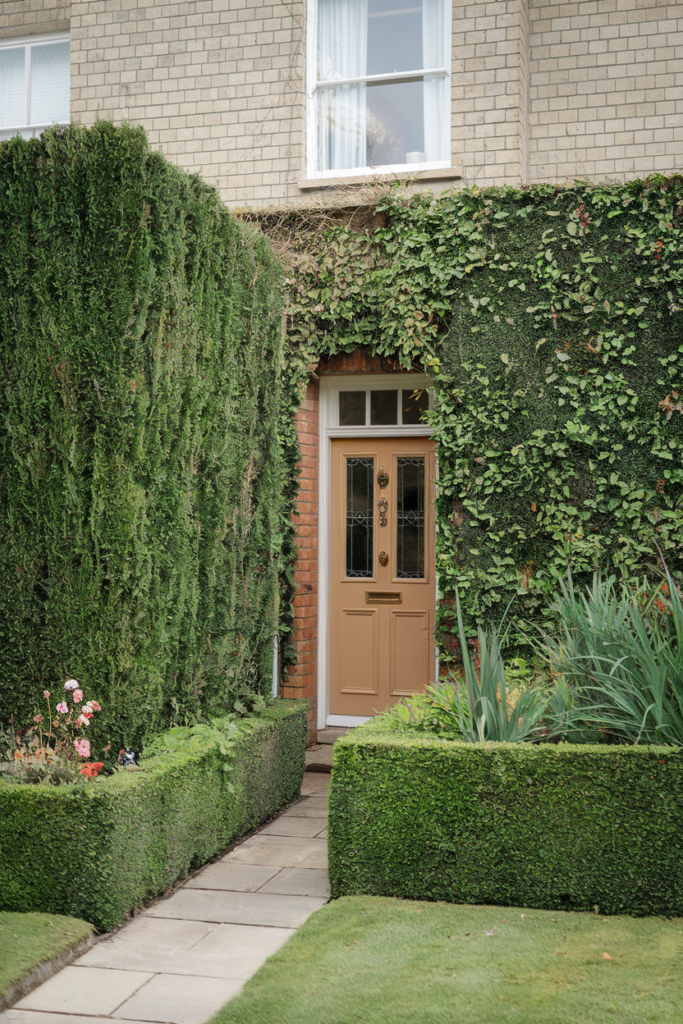 This unique and formal entrance uses a towering, dense, clipped evergreen hedge to create a dramatic, narrow hallway leading to a light brown front door. The house wall next to the door is almost completely covered in climbing vines, creating a lush, dark green envelope.