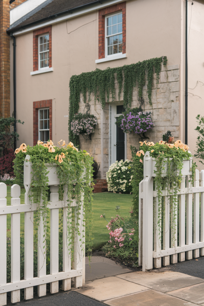 A classic white picket fence opens to a neat lawn, with the fence posts featuring integrated or mounted white planters overflowing with long, trailing green vines and soft peach-colored flowers. The facade of the house is also decorated with overflowing hanging baskets and climbing vines.