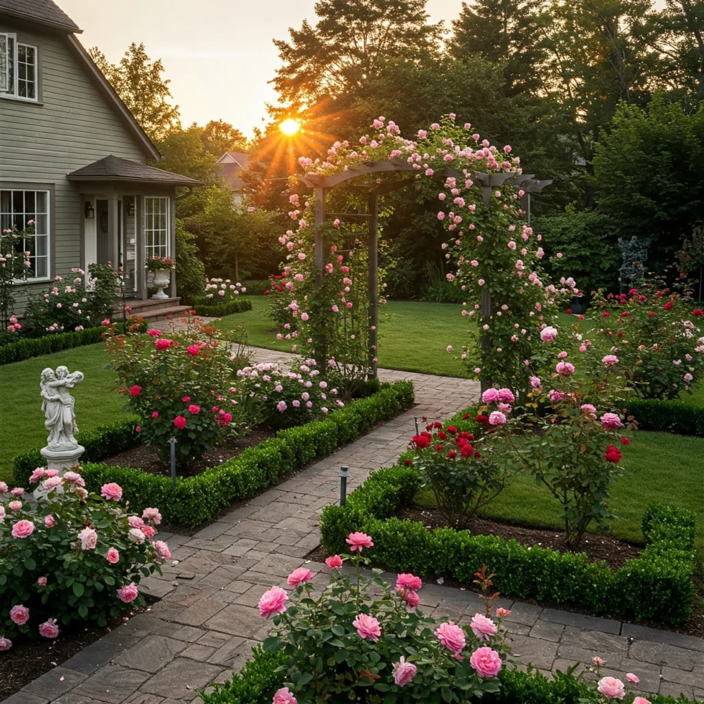 Picture a garden filled with the heady scent of roses, creating a romantic and untamed atmosphere. Use a mix of climbing and bush roses.