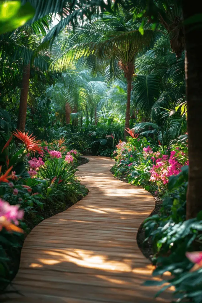 This stunning image captures a gently winding wooden path, like a boardwalk, flanked by lush, vibrant tropical foliage, including tall palm fronds, bright pink orchids, and fiery orange blooms. The dark, rich green of the surrounding plants provides a beautiful, dense backdrop that makes the light-colored wooden planks of the path really stand out. The design works visually by using the light path as a contrast to the deep shadows and rich colors of the jungle-like planting, creating a sense of mysterious depth and drama. It immediately creates a mood of secluded, exotic tranquility, like stepping into a private, sun-drenched sanctuary far away from daily life. To recreate this at home, focus on large-leaf plants and incorporate a sleek wood or composite path to maximize that luxurious, vacation-at-home feeling.