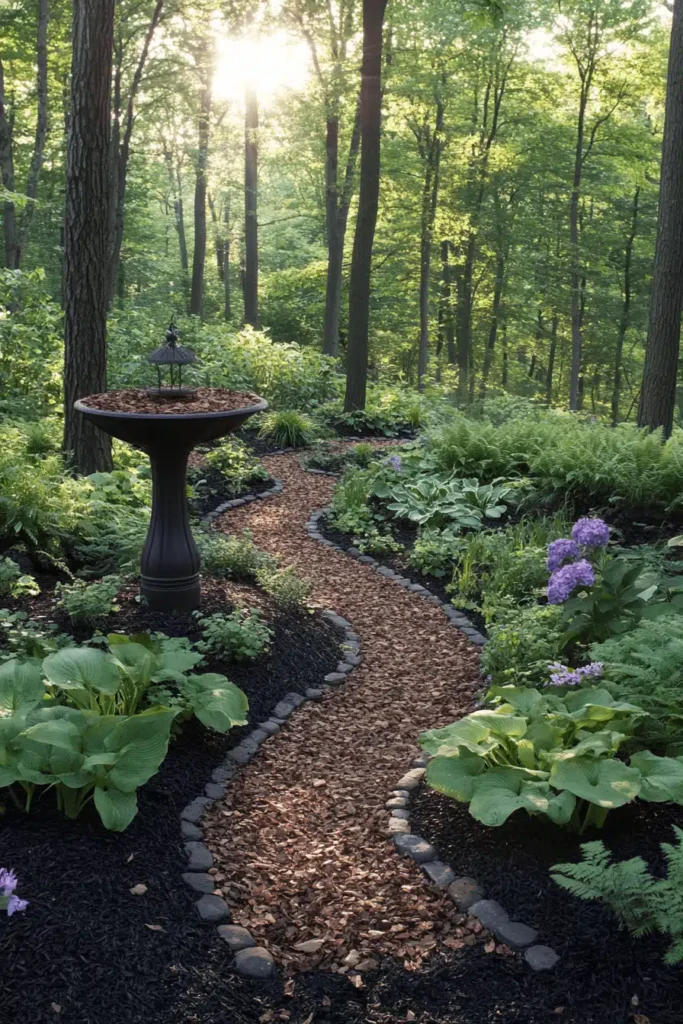 A curving path made of reddish-brown wood chips or bark mulch winds through a shady, fern-filled woodland garden, accented by dark black mulch and smooth river stones along the edges. The path’s gentle S-curve draws the eye through the scene, while the textural contrast between the soft bark, the dark surrounding mulch, and the smooth grey stones creates a visually rich boundary. This design cultivates a quiet, cool, and deeply restful mood, like discovering a secret forest trail where the air is still and the light is soft. The rustic birdbath nestled near the curve reinforces the natural, peaceful vibe. To achieve this calming effect, utilize shade-loving plants like hostas and ferns, and use chunky, organic mulch for the path itself.