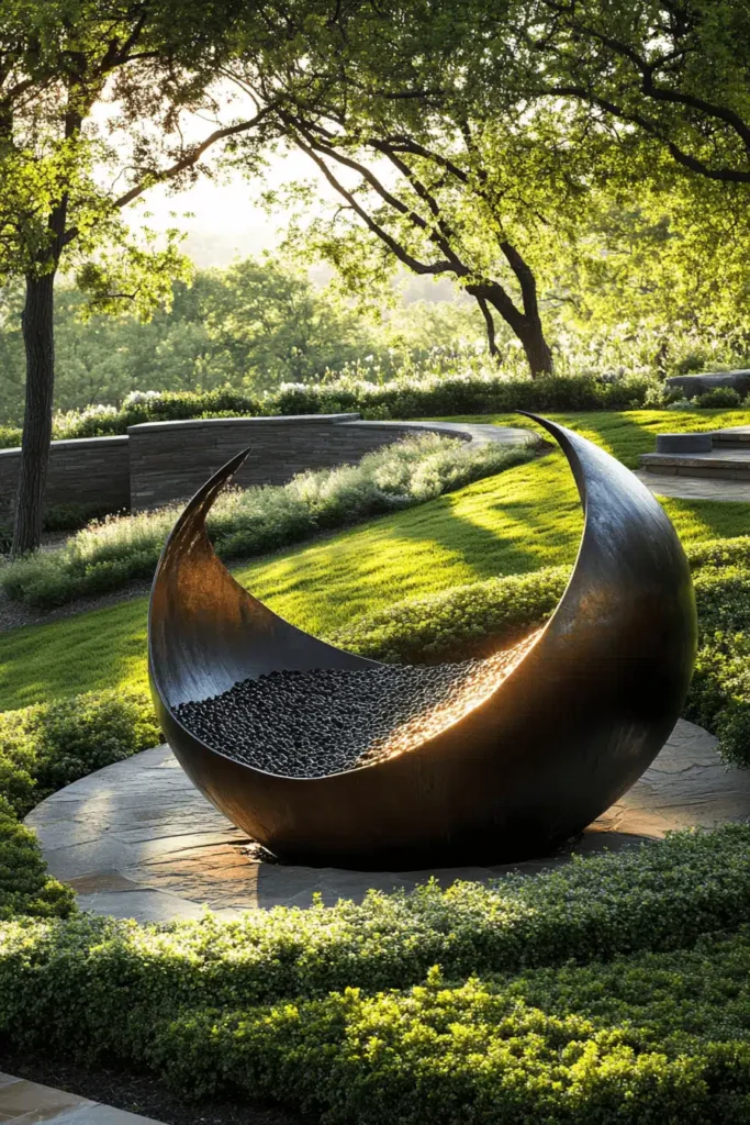This striking image features a massive, sculptural crescent moon made of dark metal, filled with smooth black stones, resting on a circular stone patio amid a meticulously manicured lawn. The design is incredibly impactful because the bold, geometric form of the sculpture contrasts dramatically with the soft, natural curves of the surrounding hedge and the gently sloping lawn. It immediately sets a tone of modern, sophisticated elegance and quiet drama, acting as a stunning piece of outdoor art that encourages contemplation. The way the sunlight catches the edge of the metal enhances the dramatic effect. To bring in this level of sophistication, incorporate one large, unexpected piece of artwork or seating that makes a powerful statement against an otherwise green and simple backdrop.