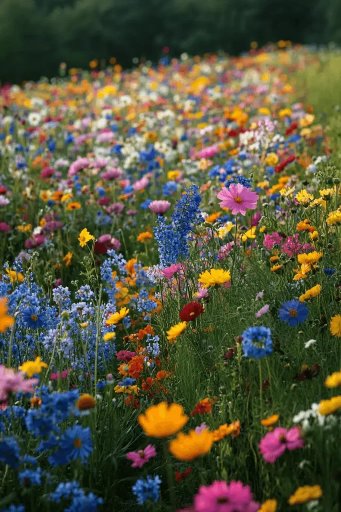 A dreamy expanse of tall grass is bursting with a myriad of wildflowers in every color imaginable—vivid blues, sunny yellows, deep reds, and cheerful pinks—creating a stunning tapestry of color. The visual impact comes from the sheer density and variety of the blooms, which blur together to form an impressionistic, vibrant field of color that is absolutely captivating. This design generates a joyous, free-spirited, and intensely natural mood, celebrating the untamed beauty of the countryside. It’s perfect for attracting pollinators and adding huge visual interest with minimal maintenance once established. Simply sow a good quality mixed seed packet—like a native wildflower mix—over a large area and let nature take its beautifully messy course.