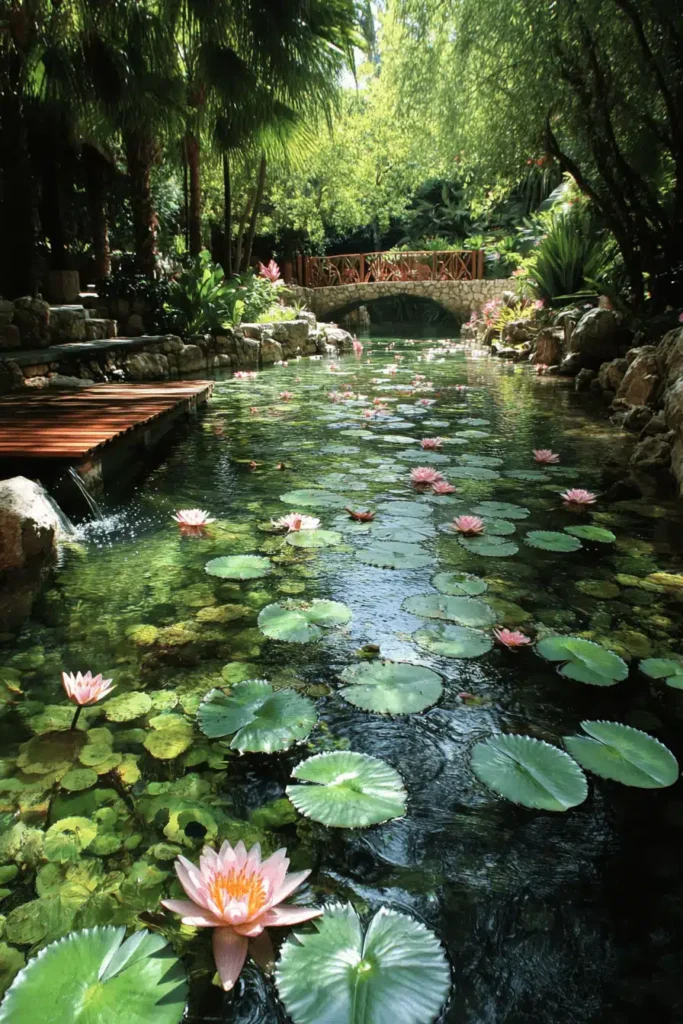 A serene, slow-moving stream or narrow pond is covered with lily pads and dotted with soft pink water lilies, flowing gently under a small, rustic wooden bridge in a shaded, tropical setting. The composition is stunning due to the reflection of the surrounding dense greenery in the clear water, while the bridge offers a lovely, inviting focal point that draws the eye deeper into the scene. This design creates a profound sense of peace and deep immersion in nature, evoking a quiet, meditative space perfect for reflection. The sound of the small wooden waterfall visible on the left would add an extra layer of sensory calm. Consider adding water features and aquatic plants if you have the space to tap into this deeply relaxing atmosphere.