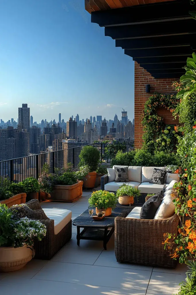 This image showcases a stylish rooftop terrace high above a sprawling city skyline, featuring comfortable wicker patio furniture, large terracotta planters filled with greenery, and brick walls covered in climbing vines. The design masterfully softens the harsh urban environment by layering natural materials like wicker, terracotta, and rich green plants against the backdrop of glass and concrete. The mood is one of sophisticated escape; it feels like a private, luxurious, and super-cozy lounge space where you can enjoy the stunning cityscape in complete comfort. Even on a small balcony, you can create a similar refuge by clustering several potted plants and choosing one or two pieces of comfortable, weather-resistant seating.