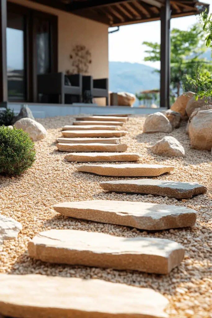 Large, flat, organically shaped stone steps are laid out over a bed of fine golden gravel, leading up toward a simple, covered patio in a minimalist, Japanese-inspired setting. The design is successful because of the beautiful contrast between the smooth, solid stone pavers and the fine, textural gravel surrounding them, emphasizing clarity and intentionality in every element. It conveys a clean, calm, and highly structured mood, reflecting the peaceful simplicity of a Zen garden where every object has its place. The sparse plantings and large, smooth boulders keep the focus on the natural elements of stone and light. Use similar, well-defined stepping stones and gravel to create a pathway that feels simple, clean, and grounding.
