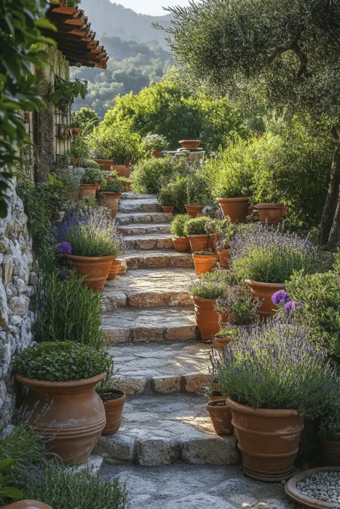 A rustic, sun-drenched stone staircase leads uphill, beautifully flanked by a staggered array of terracotta pots filled with lavender, rosemary, and other fragrant, Mediterranean-style herbs and plants. The visual charm comes from the repetition and varying sizes of the terracotta pots against the rugged texture of the stone steps and wall, creating a cascade of greenery and color. This design fosters a warm, aromatic, and timeless mood, reminiscent of a hidden garden path in a beautiful European village. The scent of the herbs alone would make this space magical. To recreate this charming look, simply line any existing stairs or walkway with a collection of terracotta pots for instant, aromatic curb appeal.