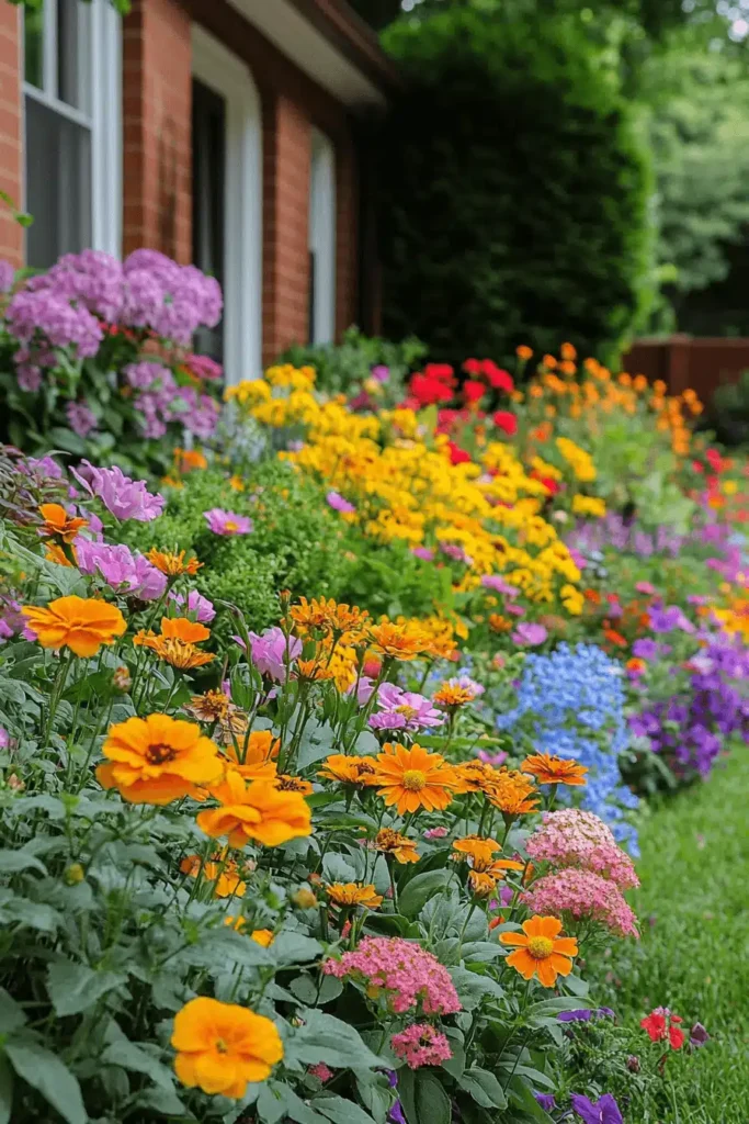 A colorful, overflowing flower bed borders a simple brick home, featuring a glorious mix of orange, yellow, pink, red, and purple annuals and perennials in happy disarray. This design is visually compelling because of the sheer abundance and intentional layering of colors—the bright hues pop beautifully against the darker red brick of the house and the green lawn in the foreground. It evokes a wonderfully cheerful, rustic cottage mood that feels welcoming, unpretentious, and full of life, like a painter’s palette brought to life in the garden. This style encourages natural growth and a delightful, haphazard charm. For a similar look, choose a variety of bloom shapes and plant densely, focusing on complementary color groups like oranges and purples to make the bed look truly dazzling.