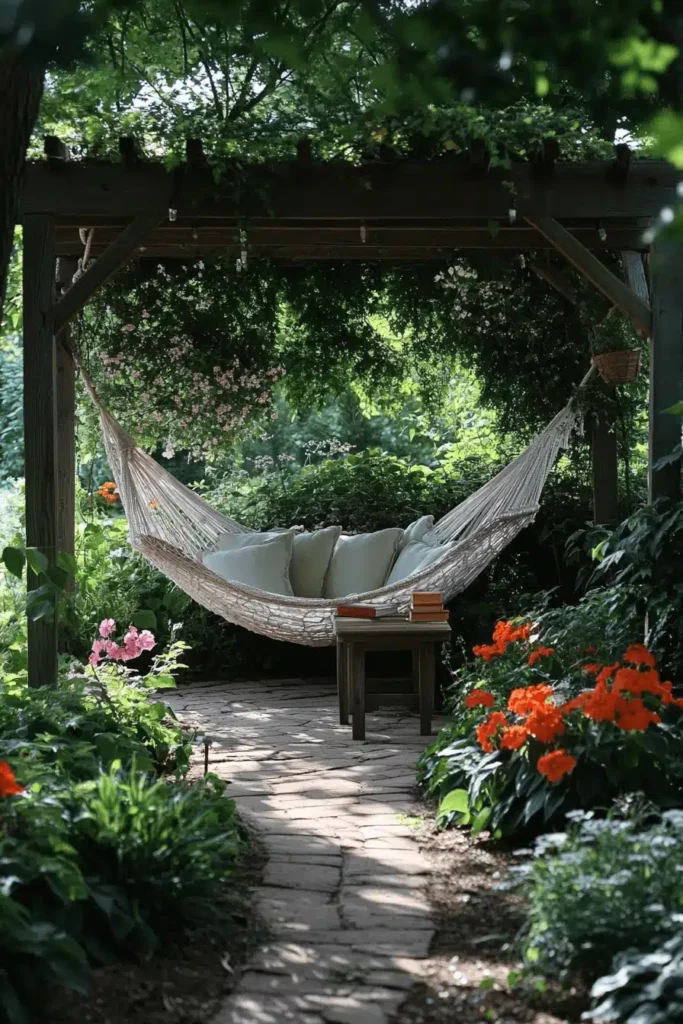A cozy, oversized cotton hammock, piled high with soft, pale-colored pillows, is suspended under a rustic wooden pergola, surrounded by lush, dark green foliage and pops of orange flowers. The visual appeal lies in the inviting softness of the hammock and pillows, which creates a sheltered, intimate focal point deep within the greenery. This space radiates a mood of ultimate relaxation, quiet seclusion, and comfortable refuge, inviting you to grab a book and spend the whole afternoon swaying gently. The partial shade adds to the private, cool feeling. Install a sturdy hammock or swing chair in the shadiest corner of your yard or patio to instantly create your own personal escape hatch.