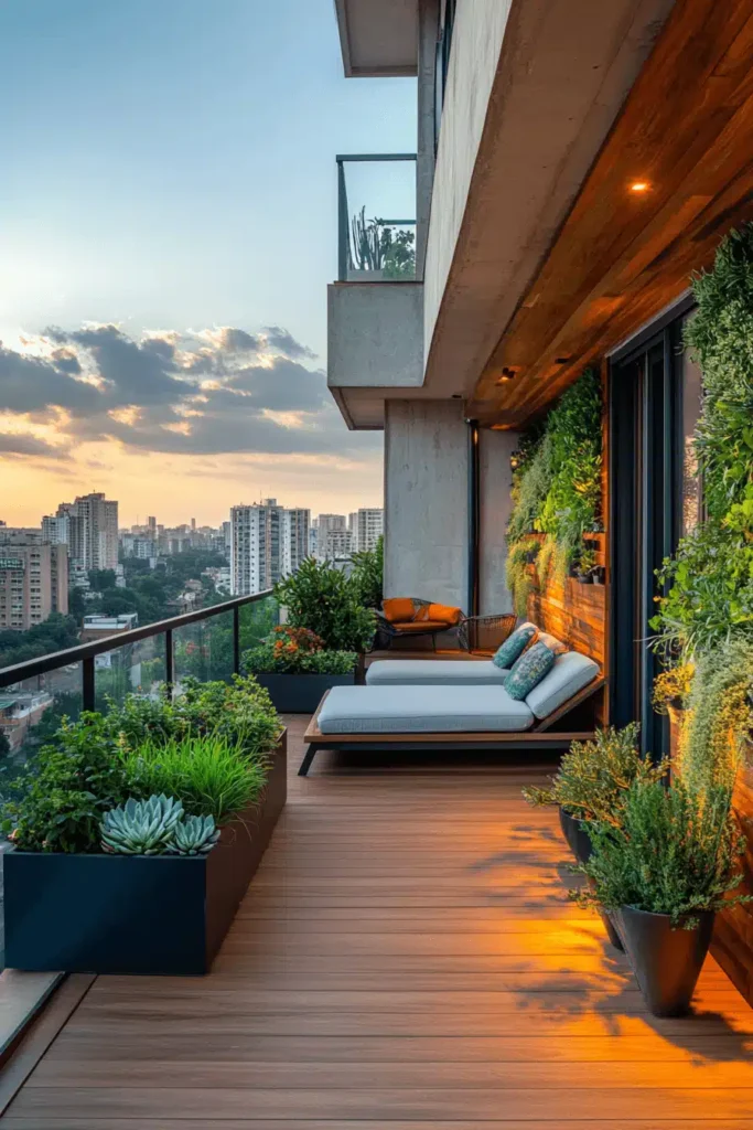 This stunning contemporary balcony features sleek wood decking, a glass railing, minimalist lounge chairs, and a striking floor-to-ceiling vertical garden wall built into the structure. The design is modern and chic, using the vertical space to maximize greenery without cluttering the floor, while the wood and plants soften the surrounding concrete and glass of the urban high-rise. It exudes a clean, luxurious, and restful mood, proving that even small city balconies can be transformed into private, high-design retreats. Notice how the linear planters echo the architecture’s clean lines. Vertical planters or wall-mounted trellises are the perfect solution for apartment dwellers looking to incorporate vibrant greenery without sacrificing precious floor space.