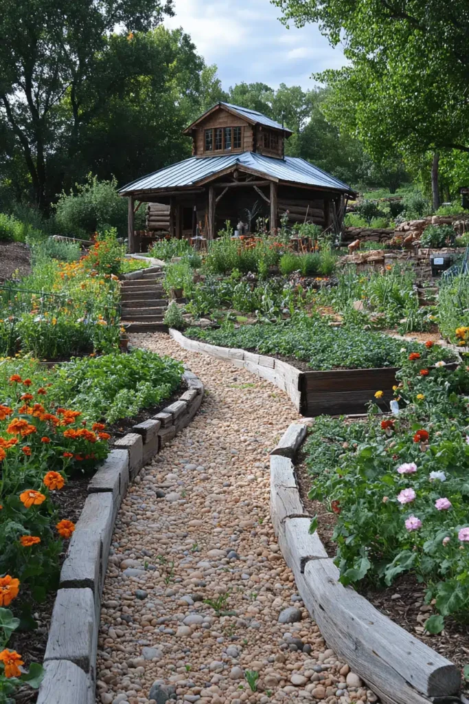 A meandering path made of light-colored pea gravel, edged with rustic, stacked wooden logs, winds its way through neat raised garden beds overflowing with vegetables, herbs, and cheerful marigolds. The charm of this design comes from the blend of functional, productive garden space with the organic, soft textures of the wood and gravel path, which softens the overall look. It evokes a wholesome, grounding, and productive mood, suggesting a space where one can connect with the earth and grow fresh food. The elevated log cabin in the background adds a charming, rustic cottage feel. Use simple materials like untreated lumber or stones to edge your garden beds for a natural, cottage-garden aesthetic.