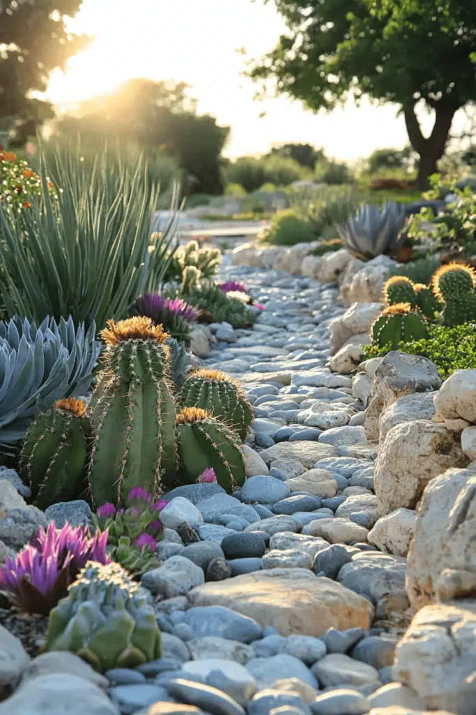 A dry riverbed path, made of smooth, light-grey river stones, is bordered by large, rough-hewn boulders and planted with drought-tolerant succulents and cacti, including barrel cacti and aloes. This visually arresting design works by juxtaposing the smooth texture of the central path stones with the spikey, architectural forms of the desert plants and the rough texture of the surrounding rocks. It generates a mood that is dramatic, sun-baked, and beautifully structured, perfect for water-wise gardening. The bright magenta flowers add a surprising pop of color against the pale stones. If you live in a dry climate, creating a ‘river’ of stones (a rain garden) is a clever, beautiful way to manage water and incorporate low-maintenance planting.