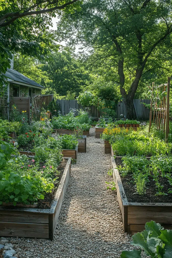 A well-organized vegetable garden is shown, utilizing simple, square wooden raised beds separated by neat, pea gravel pathways, all situated in a sunny, fenced backyard. The clean lines of the wooden beds create a visually pleasing, orderly structure that makes the garden look productive yet manageable. This design fosters a mood of industrious calm and natural abundance, perfect for anyone who loves the satisfaction of homegrown produce and a tidy space. Raised beds are a practical solution for better soil control and drainage. To achieve this organized look, keep the path material consistent and make sure all your raised bed boxes are uniform in size and material.