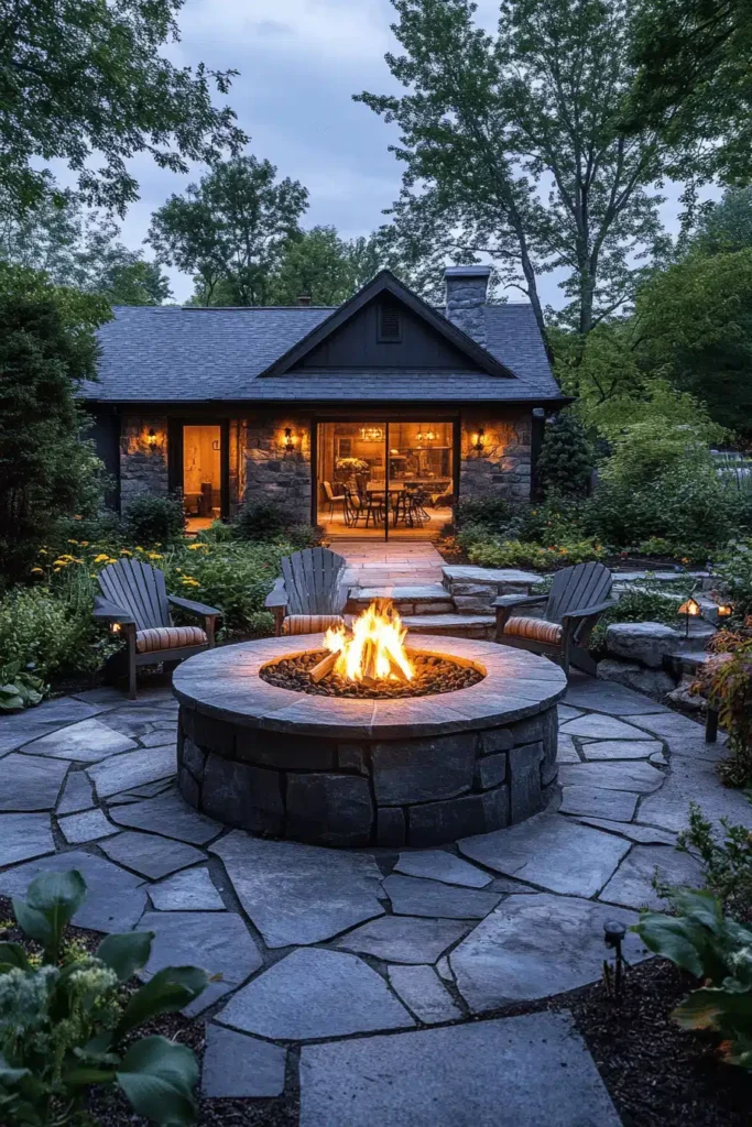 A cozy outdoor patio made of large, irregular flagstones features a stunning, round stone fire pit surrounded by comfortable wooden Adirondack chairs, set against the backdrop of a charming stone cottage. The design is grounded by the beautiful texture and pattern of the flagstone patio, which provides a solid, natural base for the warm glow of the fire. This space instantly conveys a warm, intimate, and convivial mood, perfect for cool evenings spent relaxing and sharing stories with loved ones. Low lighting and the stone materials reinforce the rustic luxury. A well-placed, sturdy fire pit becomes an immediate gathering hub, creating a natural anchor point for your outdoor seating arrangement.