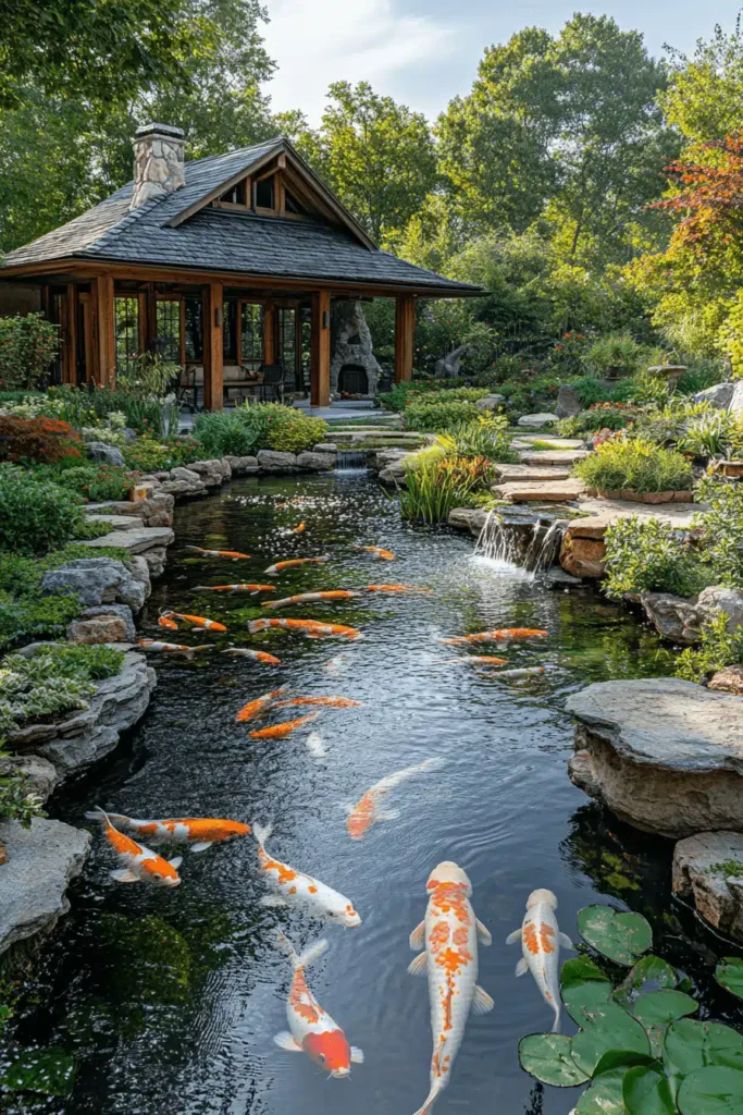 A beautiful, natural-style pond is filled with shimmering koi fish, surrounded by lush greenery, rock outcroppings, and a charming wooden cabin or gazebo nestled in the trees. The view is incredibly tranquil; the dark water provides a rich contrast to the bright orange and white of the koi, while the small waterfalls add movement and sound. This elaborate design creates a deeply peaceful, meditative, and almost Japanese-inspired mood of harmony and balance. The sound of running water is known to be instantly calming. Incorporating a pond or water feature, even a small one, is the ultimate way to bring living, soothing sound into your garden design ideas.