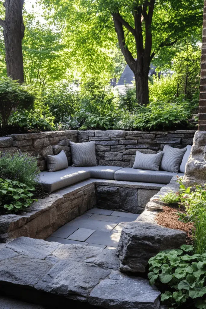 This intimate outdoor area features a sunken seating pit constructed from rough, grey fieldstone walls, fitted with soft, built-in cushioned benches and pillows, completely surrounded by lush trees and greenery. The clever use of the sunken design creates an immediate feeling of enclosure, privacy, and shelter, making it feel like a secret, cozy room carved out of the landscape. The mood here is one of peaceful retreat and intimate gathering. The stone provides beautiful, rugged texture. Designing a sunken space adds architectural interest and maximizes privacy, providing a dedicated, super-comfy spot for close conversation outdoors.