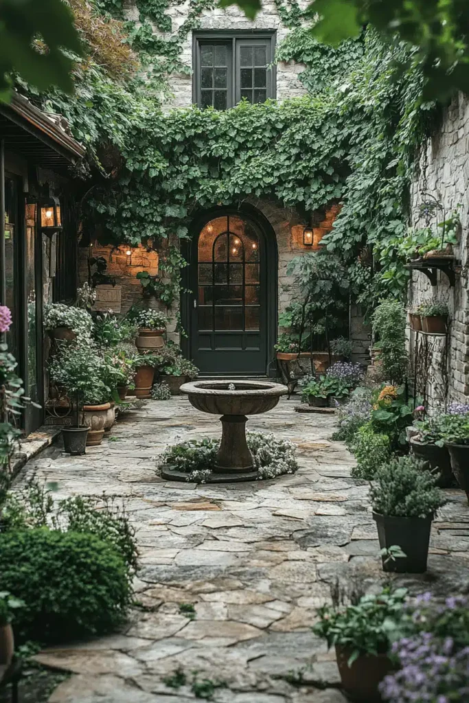 A beautiful, old-world courtyard is paved with flagstone, featuring an antique stone fountain in the center, and is enveloped by ivy-covered stone walls and countless potted plants. The ivy crawling up the wall and over the arched doorway provides incredible vertical interest and a sense of timeless age and natural decay, which is utterly charming. This design creates a deeply romantic, European, and secluded mood, feeling like a quiet, hidden haven sheltered from the outside world. The stone texture adds a wonderful roughness. To achieve this charming atmosphere, maximize potted plants around the perimeter and encourage climbing vines on any walls or trellises.