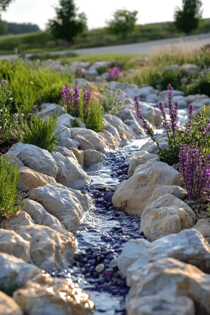 A miniature, gently winding dry creek bed is created using polished, dark river pebbles and surrounded by larger, light-colored boulders and small clusters of purple flowers. The play of light on the wet-looking, dark pebbles creates a sparkling, illusionary effect of moving water even though it’s dry, which is incredibly clever. This design is clean, textural, and low-maintenance, exuding a fresh, quiet, and contemporary natural mood. It’s an imaginative way to introduce a water feature aesthetic without the upkeep of a real stream. Create a dry creek like this to manage drainage beautifully and add a unique, permanent focal point to your yard.