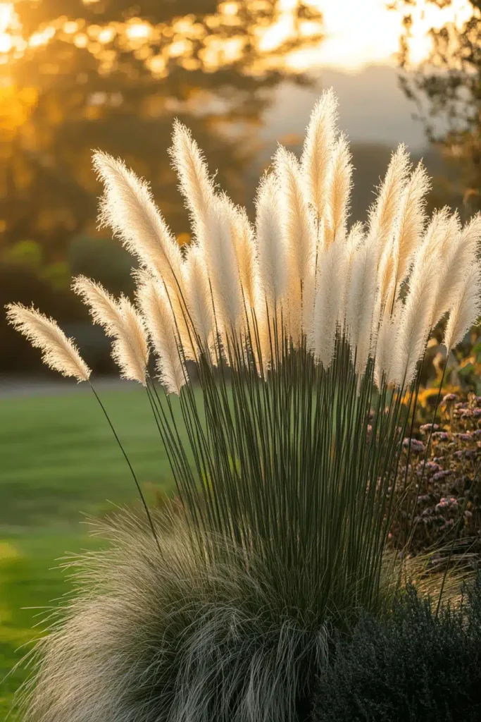 A striking clump of tall, feathery pampas grass is dramatically silhouetted against the golden glow of a sunset or warm afternoon light, standing out against a simple green lawn backdrop. The visual power of this design comes from the texture of the soft, fluffy plumes and the way they catch the light, giving the scene a soft, ethereal quality. The mood is warm, sophisticated, and slightly rustic, adding effortless drama and height to the garden with a single, impactful planting choice. Pampas grass is a fantastic choice for adding a bold, textural statement. Plant tall, elegant ornamental grasses in a spot where they can truly shine in the warm late-day sun.