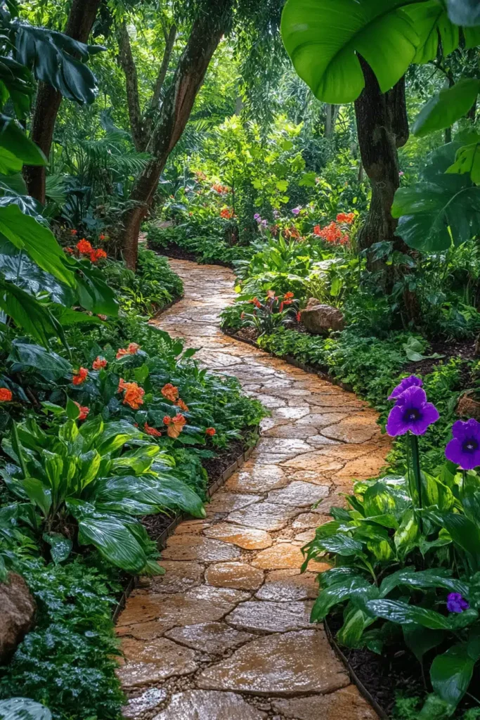 A winding path made of irregular flagstones, warm with the glow of dappled sunlight, curves through a dense, lush, almost jungle-like planting of deep green leaves and scattered orange and purple flowers. The large, irregular flagstones create an organic, rustic feel, guiding the eye into the depth of the foliage. This space feels like a magical, hidden escape—the mood is secluded, rich, and softly lit, evoking a feeling of adventure and discovery. The dense foliage creates a sound-dampening effect, making it exceptionally tranquil. Embrace large, bold foliage plants and let them spill over the edges of your natural stone paths to create this immersive, secretive feel.