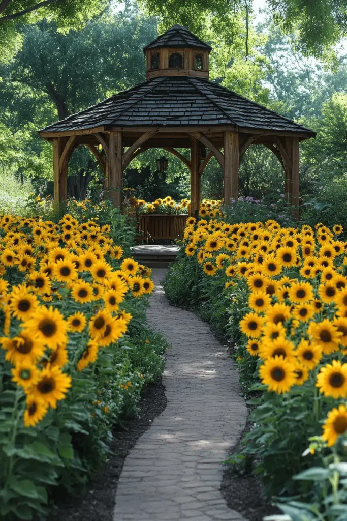 A perfectly symmetrical pathway made of brick pavers leads directly to a charming wooden gazebo, framed on both sides by towering rows of brilliant yellow sunflowers. The symmetry of the path and the joyful, overwhelming color of the sunflowers create an uplifting and grand entrance. The mood is immediately cheerful, open, and utterly romantic, like walking into a classic storybook garden. Sunflowers are a temporary but highly effective way to create a huge visual impact. Use tall, single-variety plantings along a straight path to create an impressive, tunnel-like feature that directs attention toward a destination feature like a bench or gazebo.