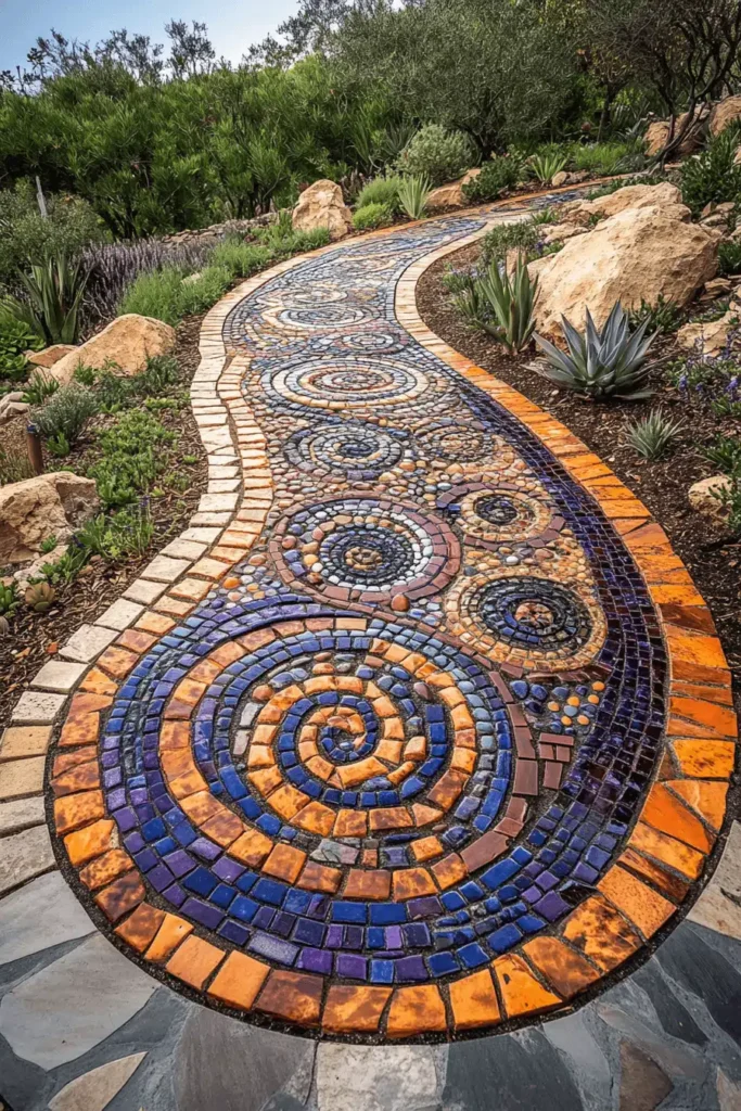 A unique, winding pathway is inlaid with a dazzling mosaic made of polished pebbles and small, colorful tiles arranged in swirling spiral patterns of orange, blue, and purple. This path is a true work of art; the vibrant colors and geometric patterns are a stunning contrast to the rougher, natural stones and simple succulents bordering it. The design conveys a fun, custom, and deeply artistic mood, making the path itself the main, unexpected focal point of the garden. Installing custom mosaic hardscaping is a fantastic way to inject personality and unique, custom flair into your outdoor space.