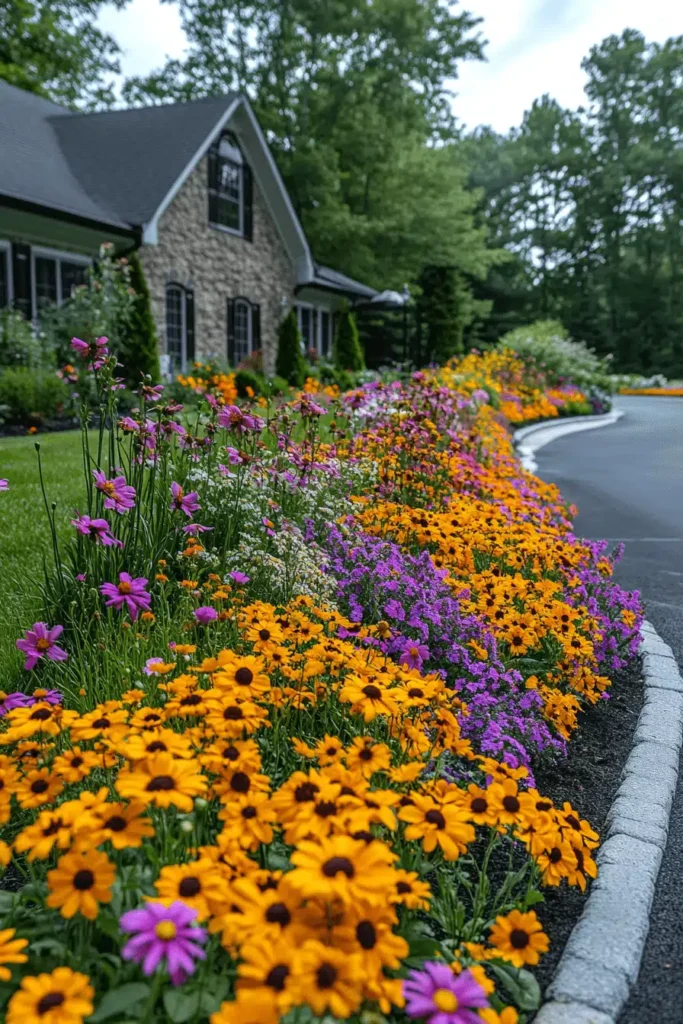 A sweeping, curved flower border follows the line of a paved driveway leading to a beautiful stone house, bursting with large drifts of bright orange/yellow black-eyed Susans and clusters of purple verbena. The mass planting of two contrasting, high-impact colors (yellow/orange and purple) is visually spectacular and incredibly effective, drawing the eye right along the edge of the property. This design sets a lavish, welcoming, and high-impact mood—it’s pure, beautiful curb appeal. Plant flowers in large, continuous blocks of single color rather than mixing them up to create this impressive, high-visual impact effect.