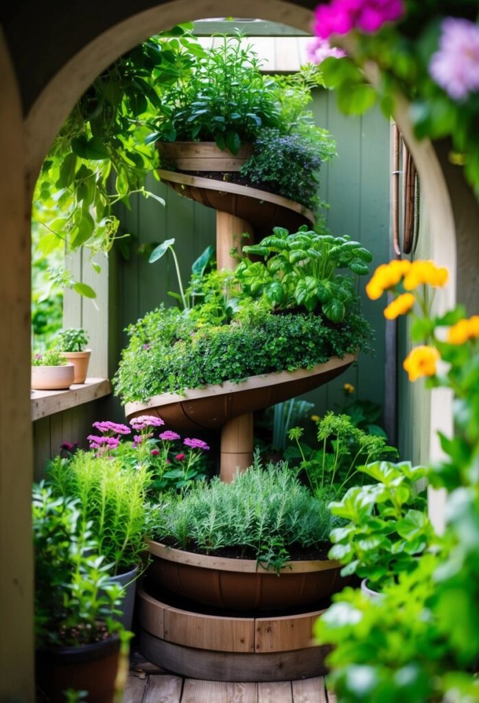 This unique garden nook idea centers on a stunning spiral planter, beautifully showcasing a tiered herb garden within a sheltered archway. The planter features wooden rings stacked in a corkscrew pattern, filled with various culinary herbs like basil, thyme, and rosemary, making it both beautiful and functional. The structure is tucked against a green-painted wall, with additional potted plants lining the adjacent wooden shelving.