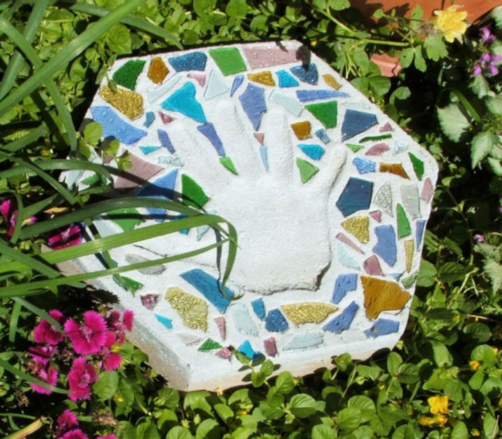 Before the cement sets, press the hand (or foot!) firmly into the center and then embed the colorful mosaic pieces around it, pushing them down just enough so they are flush with the cement surface.