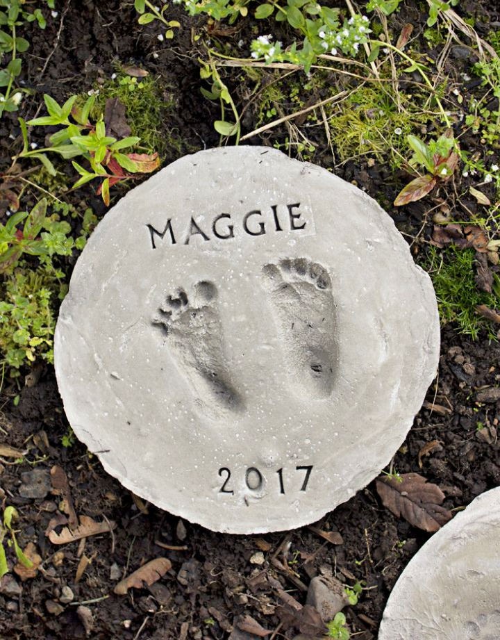 You can buy simple round molds and use alphabet stamps to personalize the names and dates, making sure to use a fast-setting cement to capture those sweet little footprints quickly and clearly!