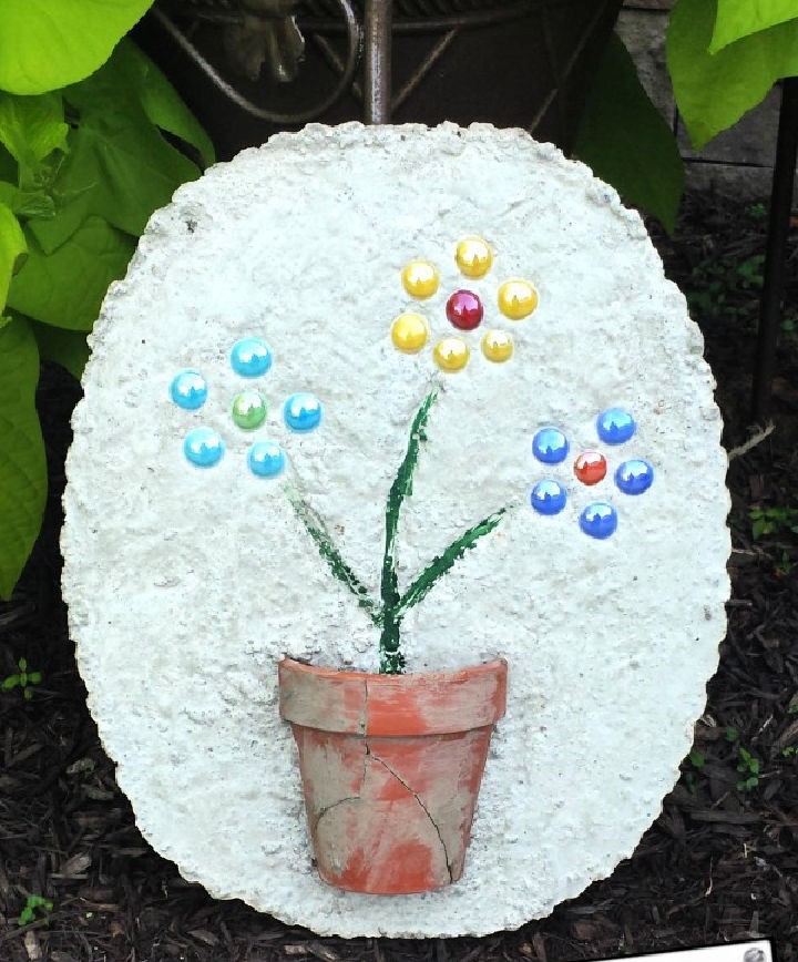 A simple, round white stepping stone is adorned with a charming, painted flower design using colorful glass gems to form the petals and center. The design features a terra-cotta pot painted directly onto the stone, from which a green stem rises to form three clusters of brightly colored gems—yellow, blue, and red.