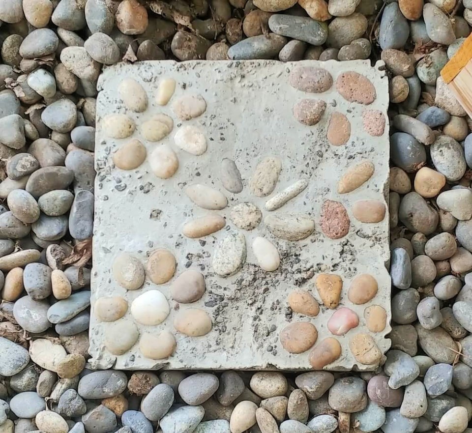 When embedding the stones, start by creating the center and petal outlines first, pressing the stones deep enough so that they are level with the cement surface for a comfortable step.