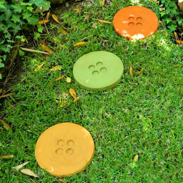 This fun path features three large, circular stepping stones shaped and detailed to look exactly like colorful buttons, sitting brightly in a grassy area. They are painted in cheerful, solid hues: a mustard yellow, a bright grass green, and a warm orange, each complete with four realistic “thread holes” pressed into the surface.