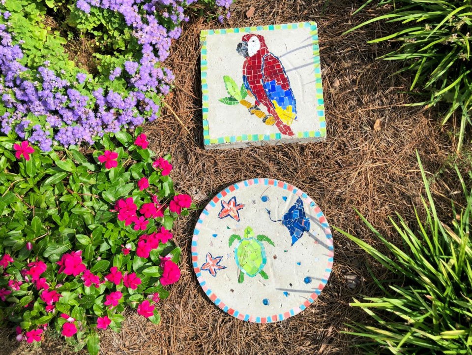 This image displays two different mosaic stepping stones resting among flowers and natural mulch: one is a square tile featuring a beautiful, detailed mosaic parrot, and the other is a round stone decorated with a turtle, starfish, and stingray. The mosaics use bright, vibrant shards of colored tile and glass for the marine and tropical designs.
