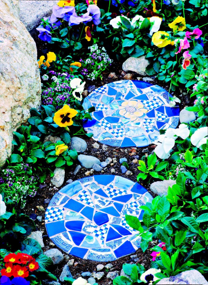 Two gorgeous, round stepping stones are shown surrounded by colorful pansies and bright ground cover, decorated with intricate mosaics made from broken pieces of blue and white china. The patterns are a charming mix of geometric shapes and a delicate yellow flower in the center of the top stone.